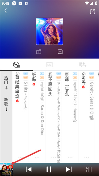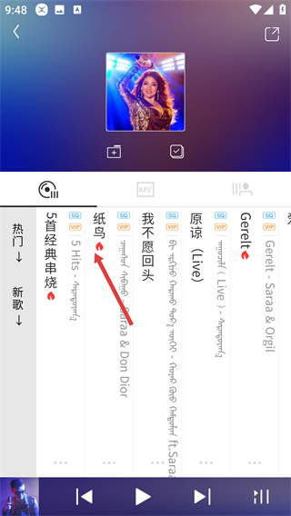 2、在【萨仁图雅】的音乐页面中,找到歌曲【纸鸟】对应的条目,点击该条目触发歌曲的播放流程。