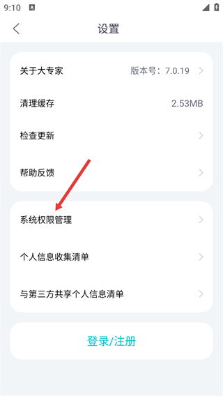 3、在设置页面,找到【系统权限管理】选项,同时可操作【清理缓存】,点击进入权限配置相关界面。