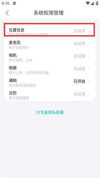 4、在【系统权限管理】页面,找到【位置信息】权限项,点击对应【去设置】按钮,配置所需的系统权限。