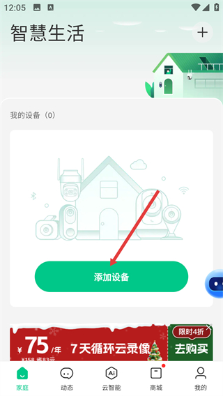 1、在智慧生活页面,点击【添加设备】按钮,可进入设备添加的操作界面。