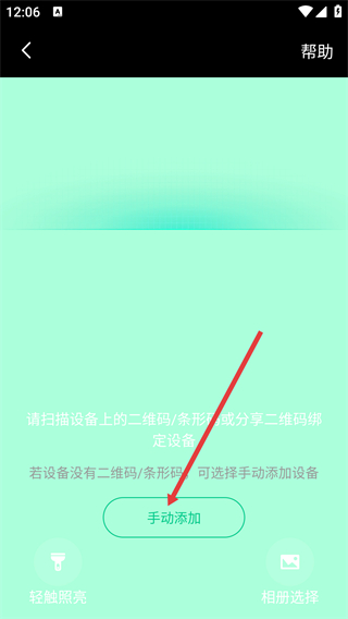 2、在设备添加界面,若设备无二维码,点击【手动添加】按钮,可进入设备选择页面。