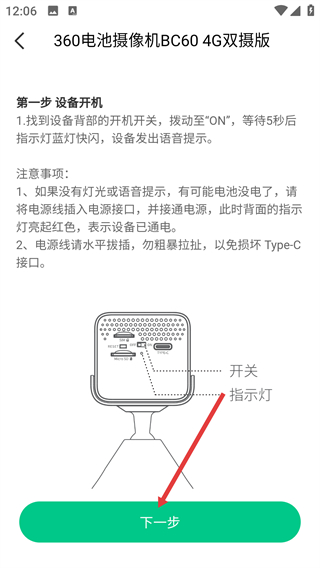 4、在设备配置页面,完成第一步开机操作后,点击【下一步】按钮,继续后续的设备连接步骤。
