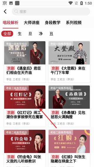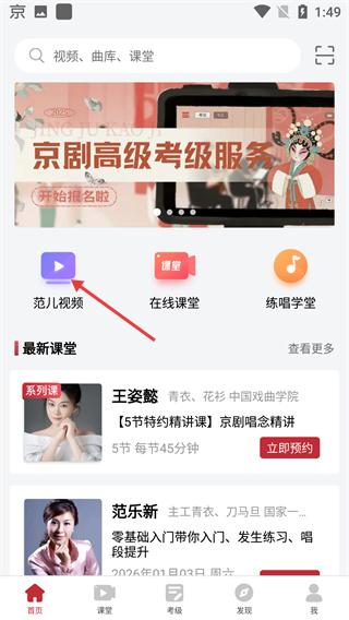 1、进入京剧应用首页,点击【范儿视频】入口,进入包含唱段解析等资源的内容页面,可浏览各类京剧学习资源。