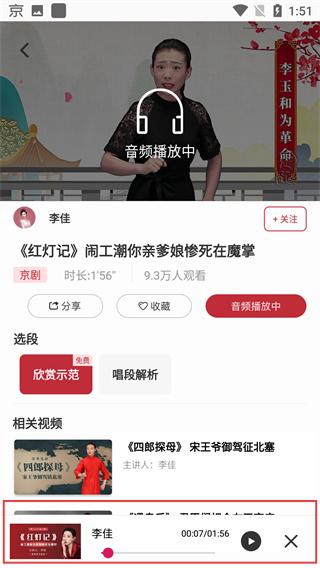 3、进入唱段详情页后,找到【点击收听音频】按钮并点击,即可启动该京剧唱段的音频播放流程。
