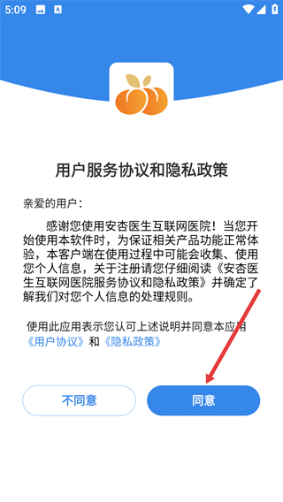 1、进入应用后会展示【用户协议】和【隐私政策】说明,阅读相关内容后点击【同意】按钮,即可进入【安杏医生】主界面使用功能。