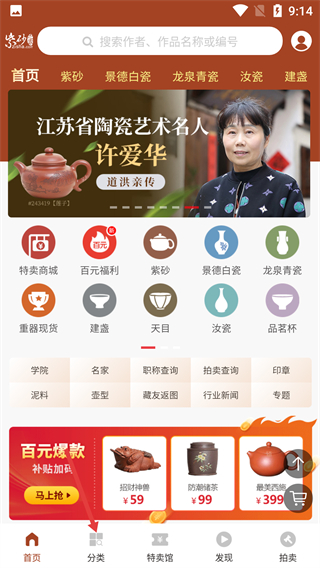 1、在首页点击底部【分类】按钮,进入商品分类页面,该页可按品类筛选如【景德白瓷】-【紫砂】等商品。