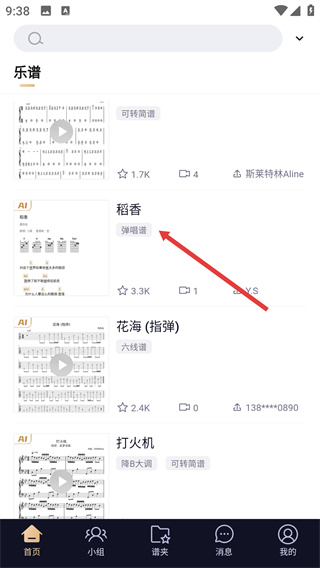 2、在乐谱列表中找到《稻香》对应的弹唱谱条目,点击进入该乐谱的详情展示界面。