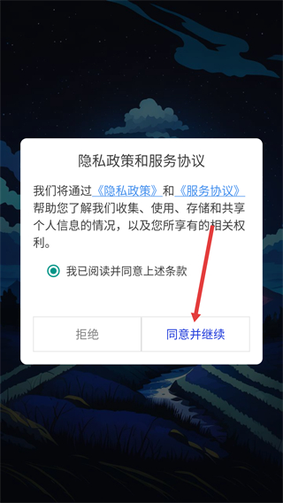 1、进入应用时会弹出【隐私政策和服务协议】弹窗,勾选“我已阅读并同意上述条款”后,点击【同意并继续】按钮,完成协议确认并进入应用。
