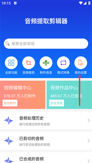 2、在音频提取剪辑器首页,点击【我的设置】选项,进入设置管理页面。