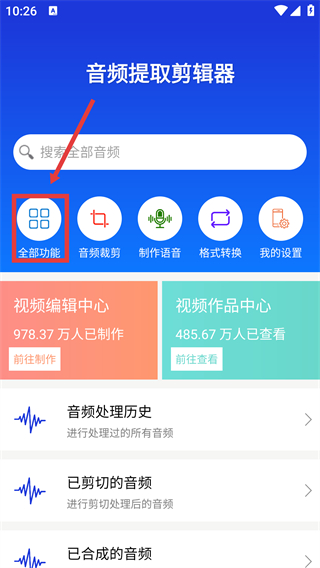1、在音频提取剪辑器首页,点击【全部功能】选项,进入功能分类页面,该页包含音频处理、声道处理等多类功能模块。