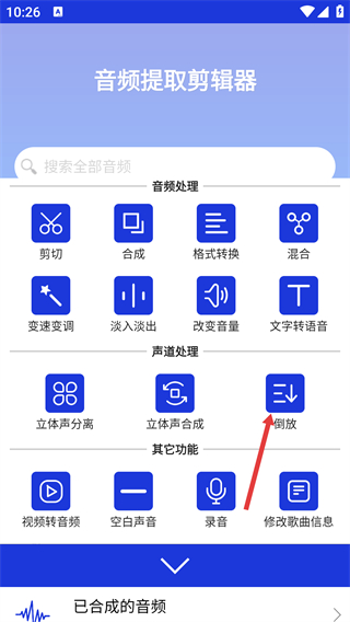2、在功能分类页的“声道处理”区域,找到【倒放】选项并点击,进入音频倒放的操作页面。