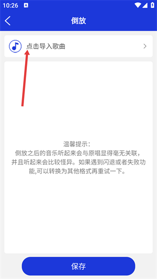 3、在倒放页面,点击【点击导入歌曲】选项,选择需要进行倒放处理的音频文件。
