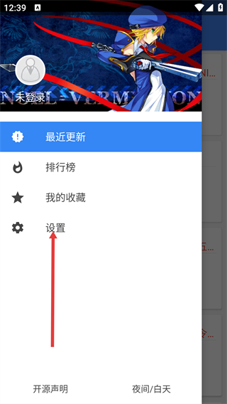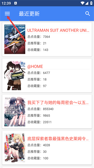 1、在【最近更新】页面,点击左上角的菜单按钮,可展开包含【排行榜】-【我的收藏】-【设置】等选项的功能列表。