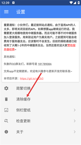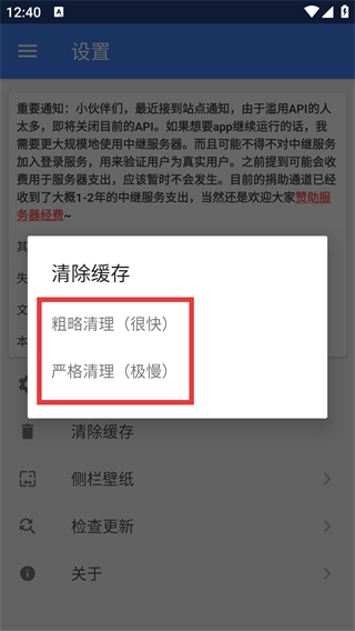 3、进入【设置】页面后,找到【清除缓存】选项并点击,会弹出缓存清理的模式选择弹窗,准备进行清理操作。