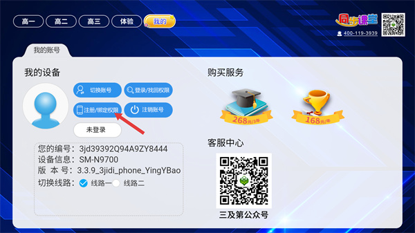 2、在我的页面中,点击【注册/绑定权限】按钮,可触发手机号码绑定弹窗,用于账号权限的管理与找回。