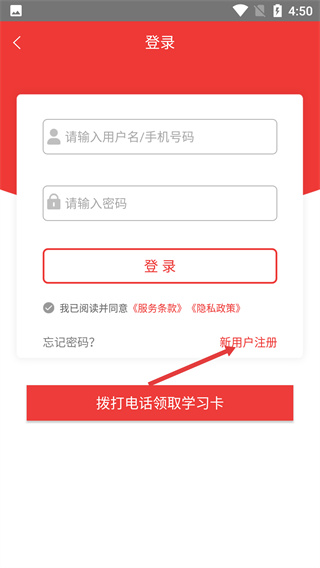 2、进入登录页面后,点击【新用户注册】按钮,可跳转至注册界面,该页面支持输入【用户名/手机号码】及密码完成登录。