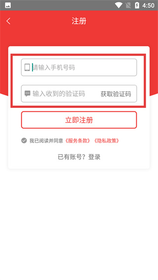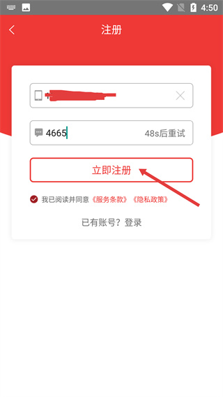 4、填好【手机号码】与【验证码】后,勾选同意协议的选项,点击【立即注册】按钮即可完成账号注册流程。
