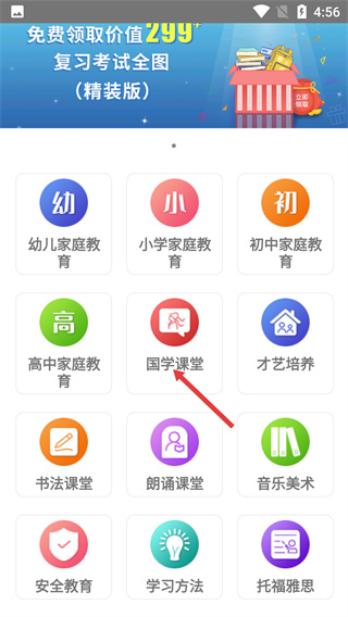 1、在软件首页点击【国学课堂】按钮,可进入对应学习板块。