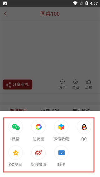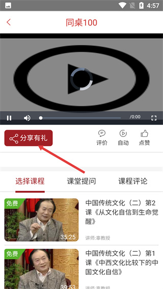3、进入课程播放界面后,点击【分享有礼】按钮可触发分享功能。