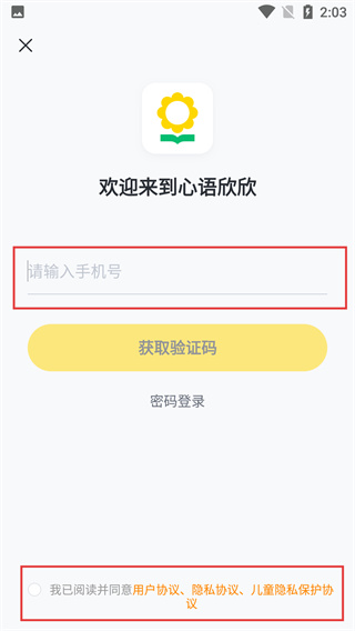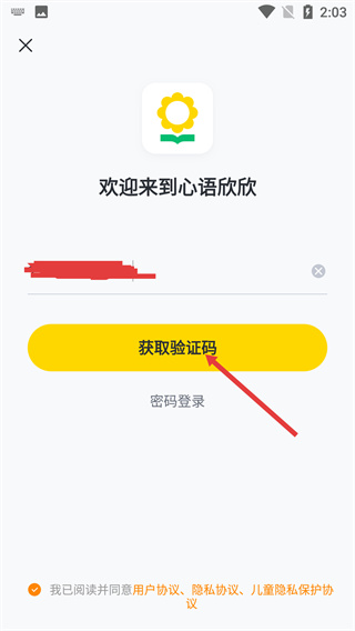 1、进入登录页,先在【请输入手机号】框填写号码,勾选【我已阅读并同意用户协议-隐私协议-儿童隐私保护协议】以激活按钮。
