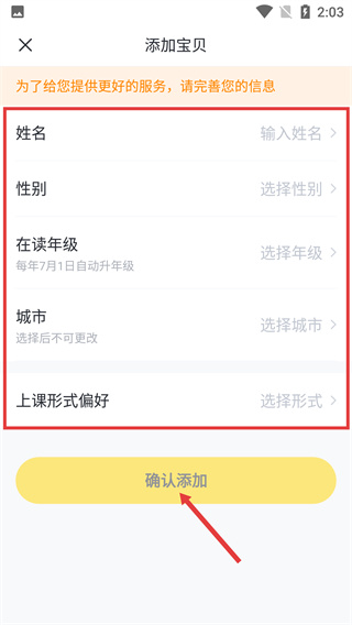 4、进入添加宝贝页,完善【姓名】、【性别】、【在读年级】等信息,填毕点击【确认添加】完成操作,即可app主界面。