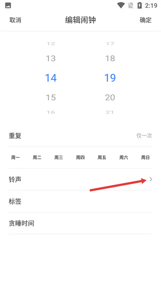 2、进入编辑闹钟页,可调整时间,设置【重复】周期,点击【铃声】选项可进入铃声选择界面配置音效。
