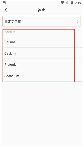 3、在铃声页面,可选【自定义铃声】或系统铃声如【Barium】、【Cesium】等,按需配置闹钟提示音效。