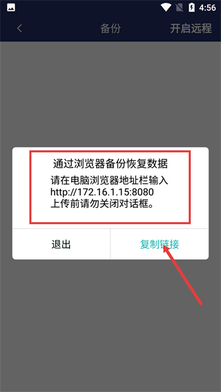 4、开启远程后,会弹出对话框,点击【复制链接】快速获取地址,完成后即可实现数据的备份与恢复。