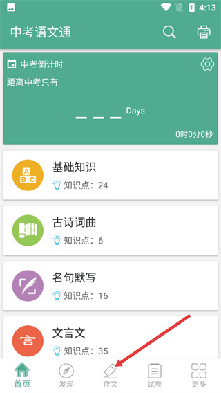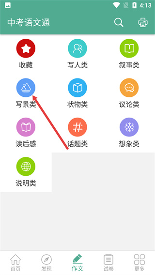 1、在“中考语文通”首页,点击底部导航栏的“作文”选项,进入作文类别的分类选择页面,准备筛选目标类型的作文。