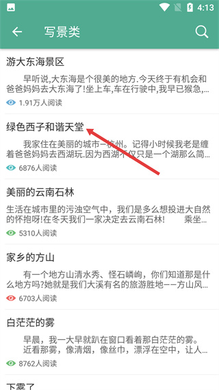 3、在写景类作文列表中,点击目标作文,进入该作文的详情阅读页面,学习其写作思路与内容。