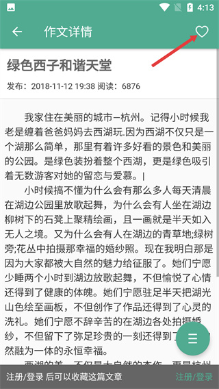 4、进入作文详情页面后,可完成作文的阅读学习,点击右上角的收藏按钮,将该作文加入收藏以便后续复用参考。