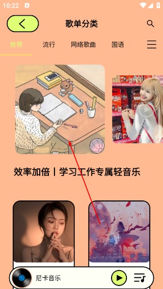 2、进入【歌单分类】页面后,选择【效率加倍|学习工作专属轻音乐】歌单,该歌单适配学习工作场景,辅助提升专注度。