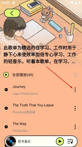 3、进入该歌单详情页后,可点击【全部播放(49)】播放歌单内音乐,也能点击歌曲旁的更多按钮进行操作。