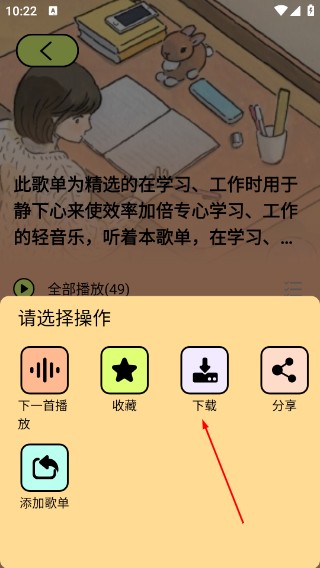 4、点击歌曲旁的更多按钮后,弹出操作菜单,可选择【下载】功能将该歌曲保存至本地,方便离线收听。