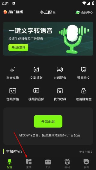 1、在【冬瓜配音】主界面,点击底部【主播】选项,可进入主播相关功能页面,也能使用【一键文字转语音】功能生成配音。