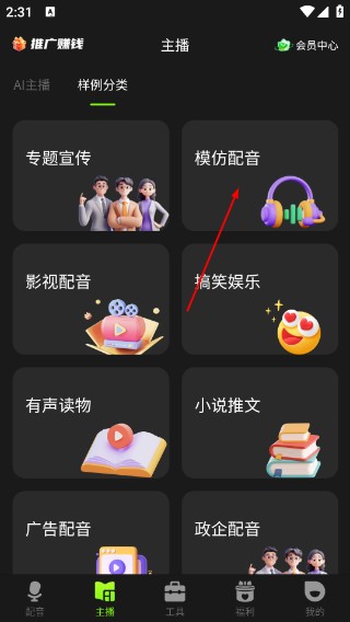 2、进入【主播】页面的【样例分类】板块,可选择【模仿配音】等不同类型的配音样例,按需挑选对应分类。