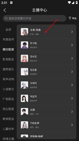 3、进入【主播中心】,可通过搜索框查找声音,也能选择如【王者-西施】这类主播,查看其配音内容。