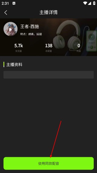 4、进入【王者-西施】的主播详情页,查看其特点后,点击底部【使用同款配音】按钮,即可应用该配音类型。