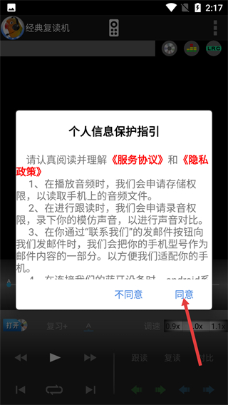 1、阅读【个人信息保护指引】中的【服务协议】-【隐私政策】,了解权限说明后,点击弹窗里的【同意】按钮,进入【经典复读机】应用主界面。
