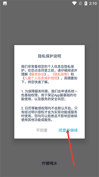 1、阅读【隐私保护说明】中的《服务协议》-《隐私政策》-《儿童个人信息保护规则》,点击【同意并继续】按钮,进入【柠檬喝水】应用主界面。