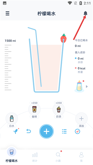 2、进入【柠檬喝水】主界面,可记录饮水数据,点击右上角铃铛图标,进入【提醒设置】页面。