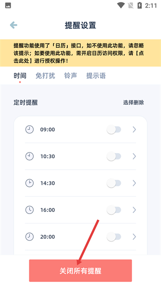 3、在【提醒设置】页面,可管理定时提醒项,点击底部【关闭所有提醒】按钮,弹出确认操作的温馨提示弹窗。