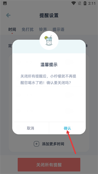 4、在【温馨提示】弹窗中,确认关闭所有饮水提醒后,点击【确认】按钮,完成所有提醒的关闭操作。