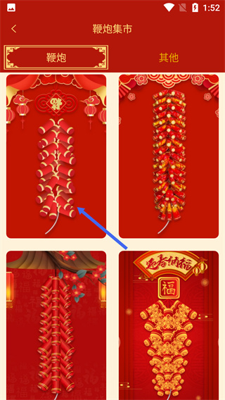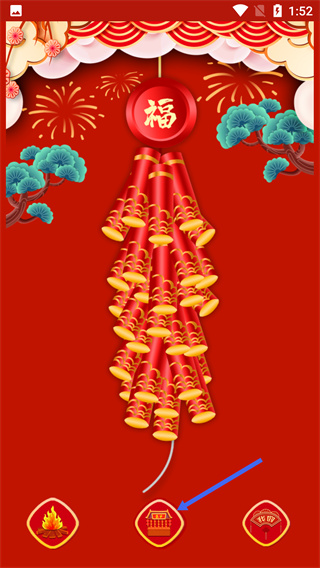 1、进入带有“福”字与鞭炮的界面后,点击底部对应按钮,可进入【鞭炮集市】页面。