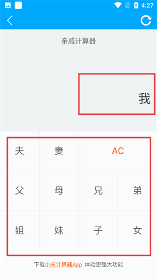 3、进入【亲戚计算器】界面后,默认以“我”为亲属关系的基准主体,下方显示各类亲属关系选项。
