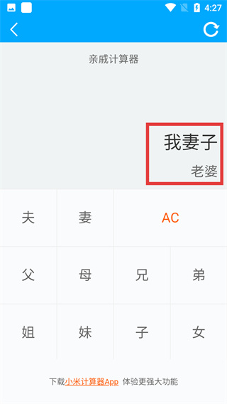 4、选择目标亲属关系,界面将自动显示对应的亲属称呼,完成亲戚关系的称呼换算。