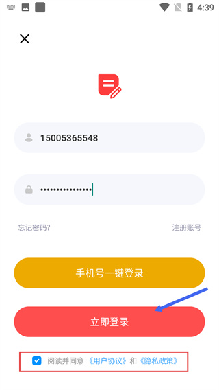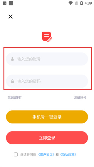 3、进入登录界面后,可选择“账号密码登录”或“手机号一键登录”方式,同时需阅读并勾选《用户协议》和《隐私政策》。