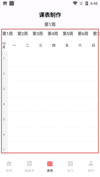 2、在【课表制作】页面,可选择对应周次,查看课表的时间格子框架。