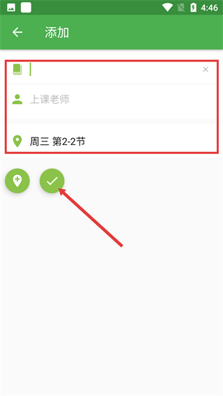 4、在【添加】页面,填写课程名称、上课老师、对应时间等信息后,点击对勾按钮,完成该课程在课表中的添加操作。