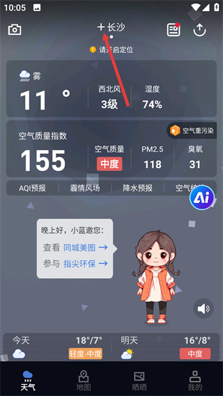 1、进入天气应用的天气页面,当前显示长沙的气象信息,点击页面顶部的加号按钮,即可进入城市添加的操作界面。